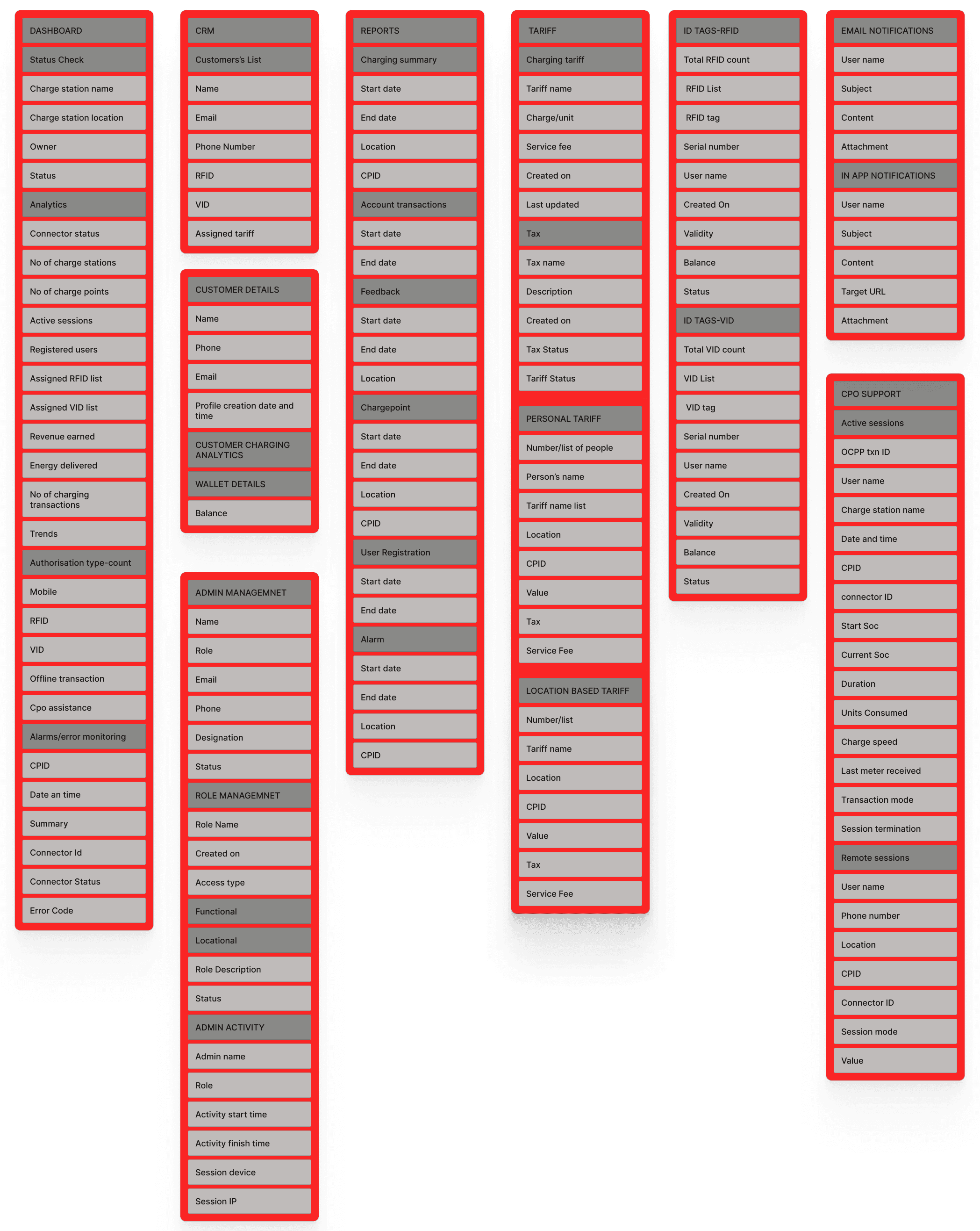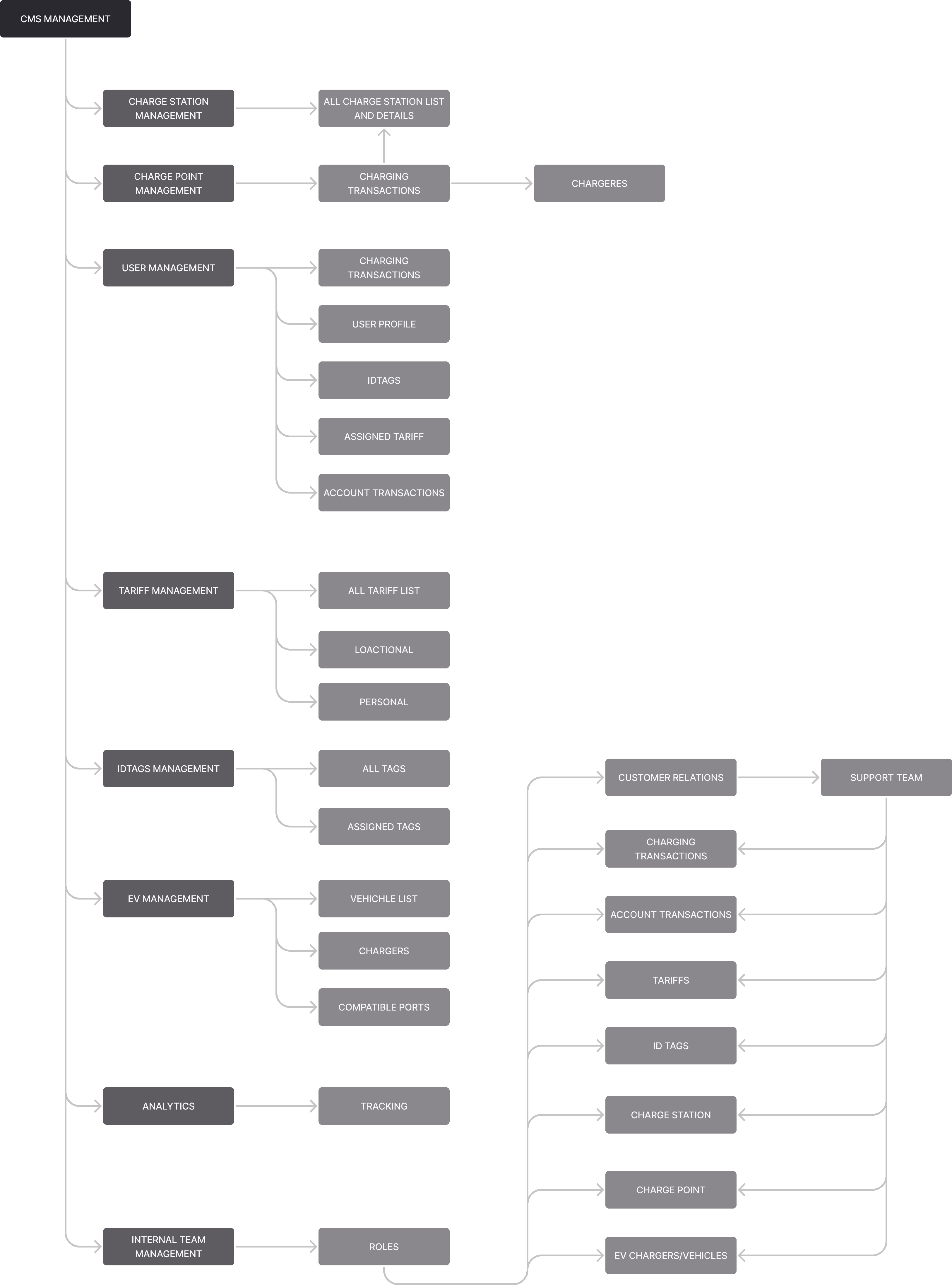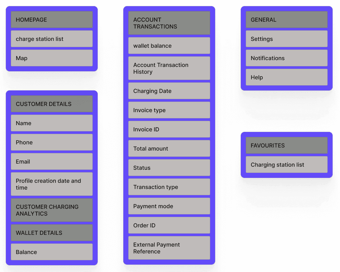 I created a detailed site map, outlining all potential functionalities for each entity. The mapping was divided into four sections, which were then pieced together to identify interactions and interdependencies. This exercise significantly simplified the system’s structure.
